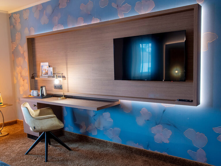 Die Zimmer verfügen über einen großen Schreibtisch mit Stuhl, einer gemütlichen Couch, einem gepolsterten Sessel, einem Smart-TV mit Radio sowie einem Safe in Laptop Größe. Alle Bäder sind geräumig mit Dusche, einem WC und Fön eingerichtet.